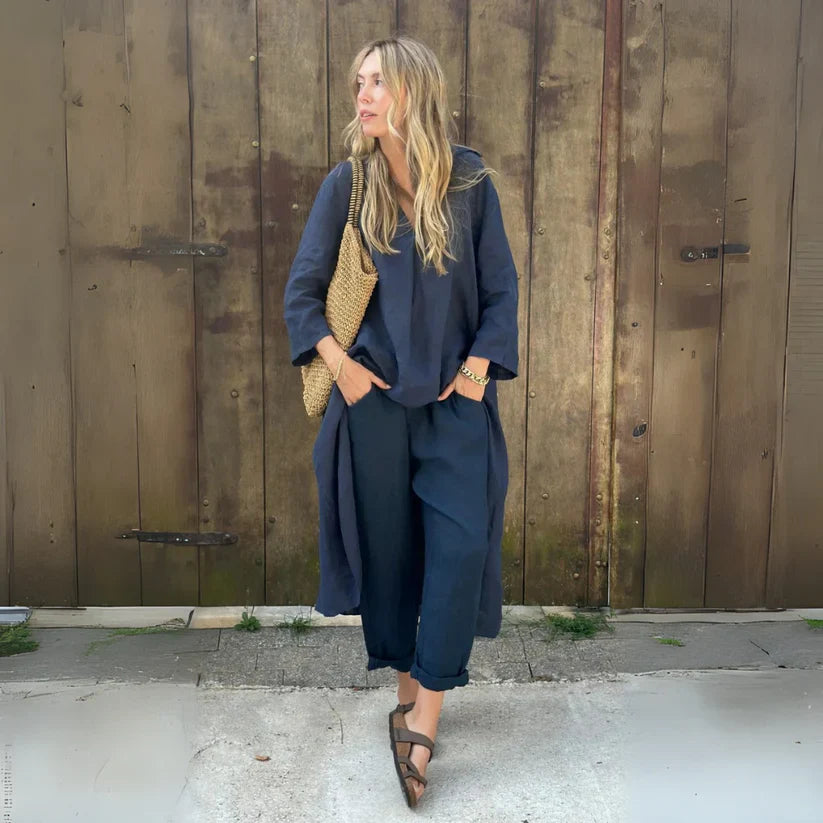 Embrace effortless style with the Livashi Cotton & Hemp V-Neck Set. This set includes a loose V-neck top and high-waist wide-leg pants. It's perfect for casual days out or weekend brunches. Pair it beautifully with white shoes, sandals, or heels.